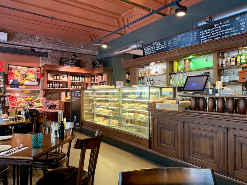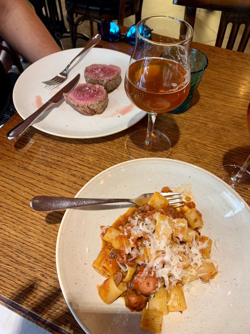 As mentioned in the last post we had a bit of a late start to our morning which was super nice to sleep in and not stress about a schedule (yes, Kate is trying very hard not to schedule things!). We left the apartment mid-morning and began our walking tour of the city – starting with the most important meal of the day: Brunch. We found an AMAZING little place called La Bottega. At first we saw a ton of people going to the restaurant next door however we found the real gem. The wait staff was super friendly and the place was so cute! They had a whole case of pastries, coffee served any way you want it, and a lunch menu that was out of this world. Brett had the fillet and as an expert on steak, he loved it! I had a pasta rigatoni with octopus ragu.