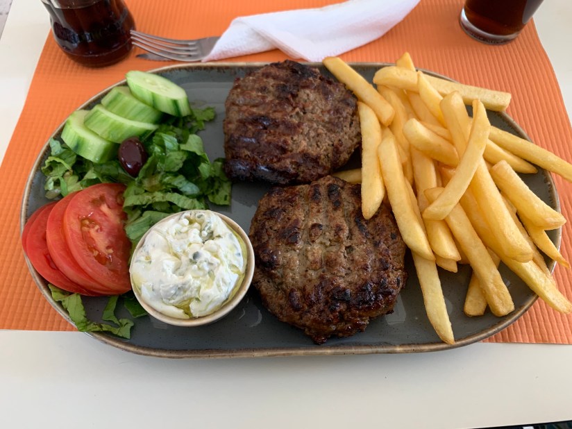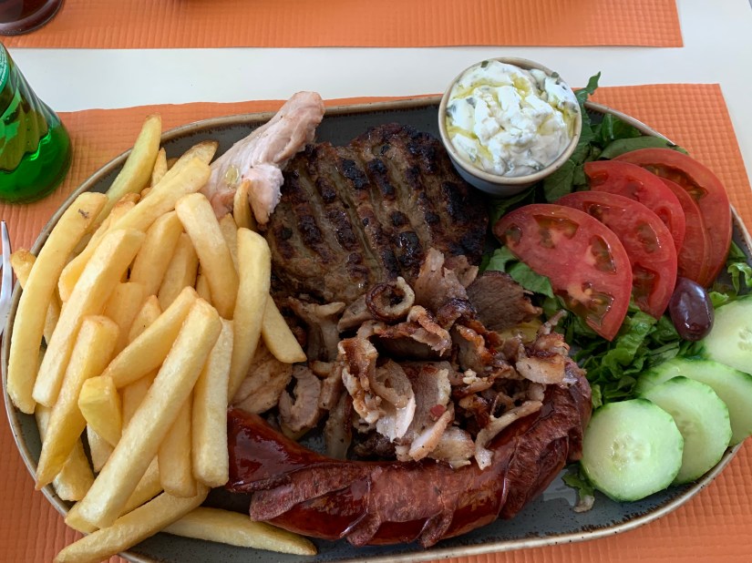 When we touched down we de-boarded the plane and proceeded to wait for our bags. This didn’t take terribly long despite about 4-5 planes all arriving about the same time. Once we collected our bags we made for the exit to find a taxi. We both noted that it was odd that we didn’t pass through some kind of customs at an international airport but figured we would have been herded like cattle to the appropriate place and didn’t think much of it. Our taxi driver was friendly and asked us to share with another gentleman since it seems like he was the last one there to provide a ride. It was a short trip to the center of Corfu where we found a nice place to eat some lunch. Little did we know when we ordered how ginormous the portions would be. The food was good but as you can imagine we were unable to finish (or hardly make a dent) in our lunches!