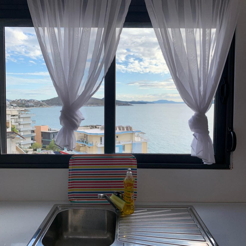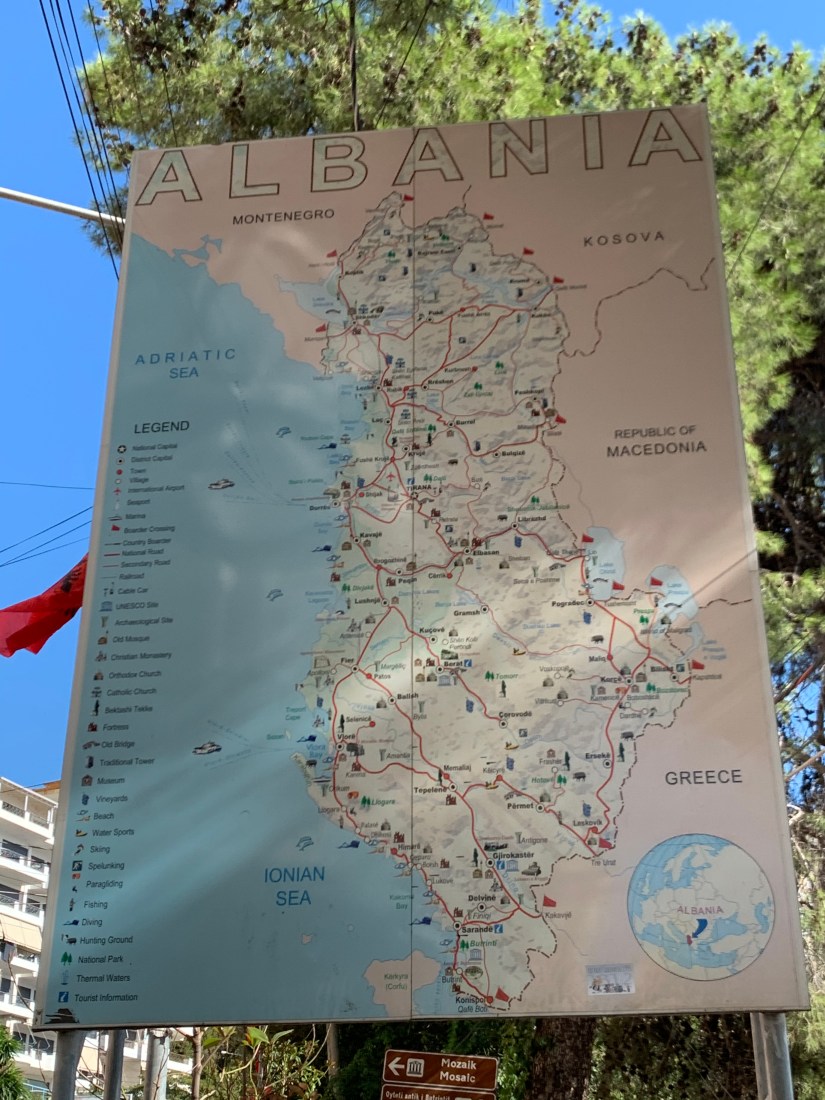When we arrived at the Albanian port in Sarande we passed through passport control again, thankfully with no issues. Before we even stepped foot off the escalator to depart the terminal we were bombarded by taxi drivers offering us rides for a “cheap price”. While the price seemed ok we were told by another passenger that it is a bit of a rip off and we should walk if we can or take the bus which would take us right by where our AirBnB is. We opted to walk and while it was hot and probably longer than we anticipated it was very nice. We even ran into the same taxi driver from the port who seemed to be stalking us just to give us a ride for 600 meters! It was fun to get to see a decent part of the town. You can tell that this is turning into the sleepy shoulder season however its been nice to be somewhere more quite. We are very much looking forward to staying in one place for a few days.