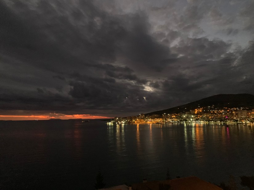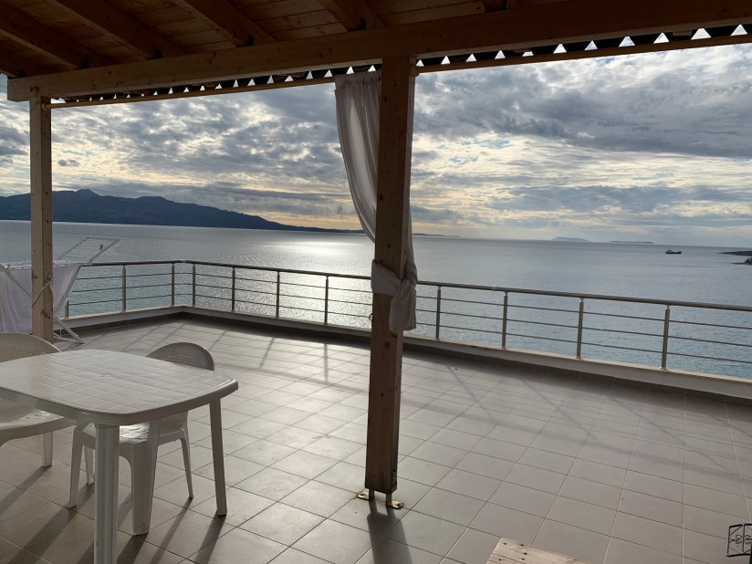 We met the AirBnB host and were showed to our apartment which is on the top floor of the building. The apartment itself is very nice, clean and spacious but it cannot compare to the balcony and view of the sea!! I think we both felt immediately relaxed upon seeing it. I imagine that while in the apartment we will spend much of our time outside. We can see the town of Sarande to our right and the island of Corfu just off to our left. There is an amazing sea breeze that passes through the entire apartment and keeps the temperature nice.